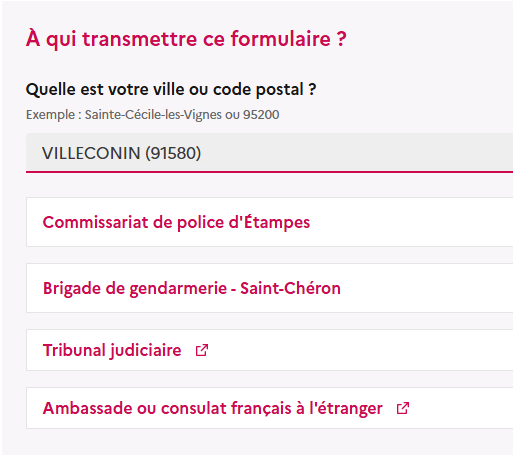 • Avec le formulaire disponible à la police ou à la gendarmerie ou au tribunal judiciaire